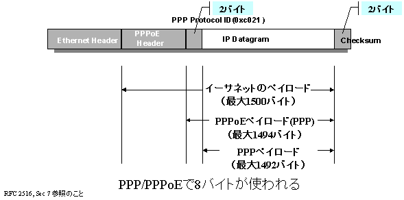 このように1500バイトのイーサネットのペイロードのうち、PPPoEヘッダに6バイト、プロトコル識別に2バイト、計8バイトがとられてしまいますので、MTUは1492かそれ以下でなければせっかくのIPデータグラムが更にこの長さの範囲に収まるよう分割(フラグメント化)されてしまい、効率がぐっと低下してしまいます。
