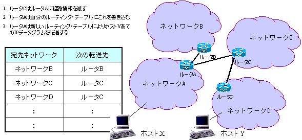 この転送(forwarding)IPデータグラムを次にどこに転送するか(Next hop: 次ホップ)を選択するのがIPルーティングアルゴリズムである。